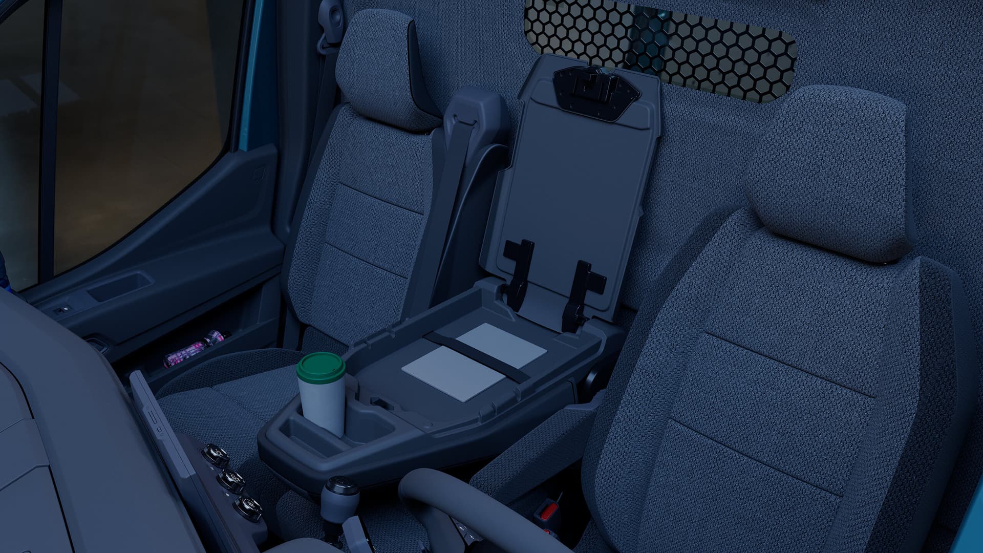 Førerorientert dashboard med spaker og knapper innen rekkevidde. Komfortable seter, mobilt kontor med brett for bærbar datamaskin* og 135 liter lagringsplass. Opplev komfort designet for å gjøre kjøreturene og daglige gjøremål enkle